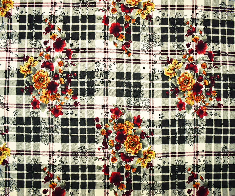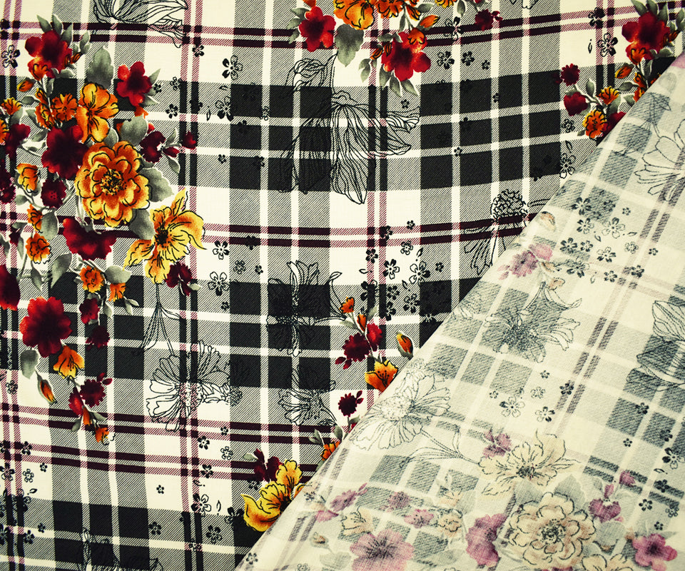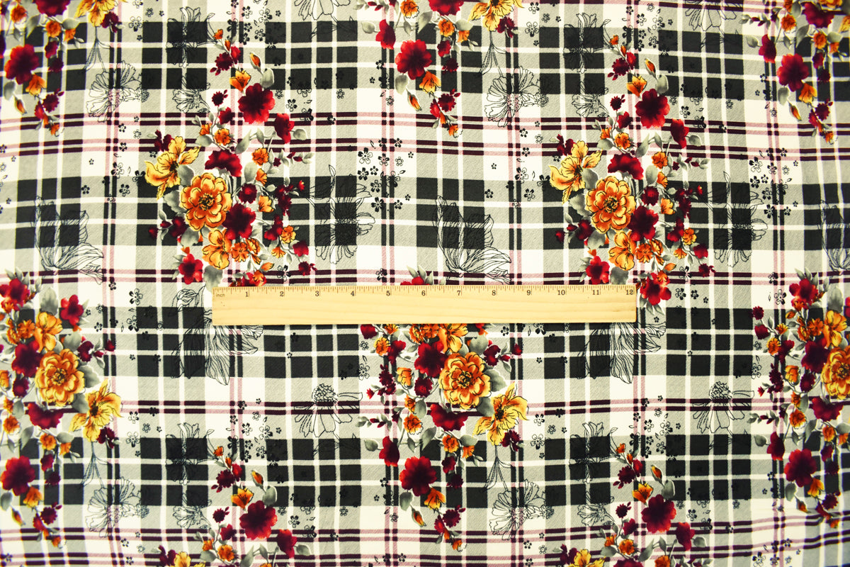 Black-Red-Multi Rayon Floral Plaid Printed Challis Woven Fabric