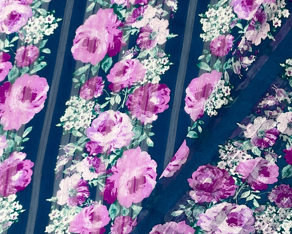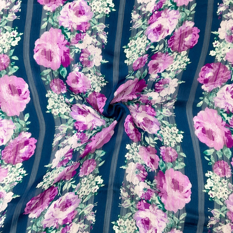 Blue-Multi Poly Floral Printed Satin Stripe Chiffon Woven Fabric