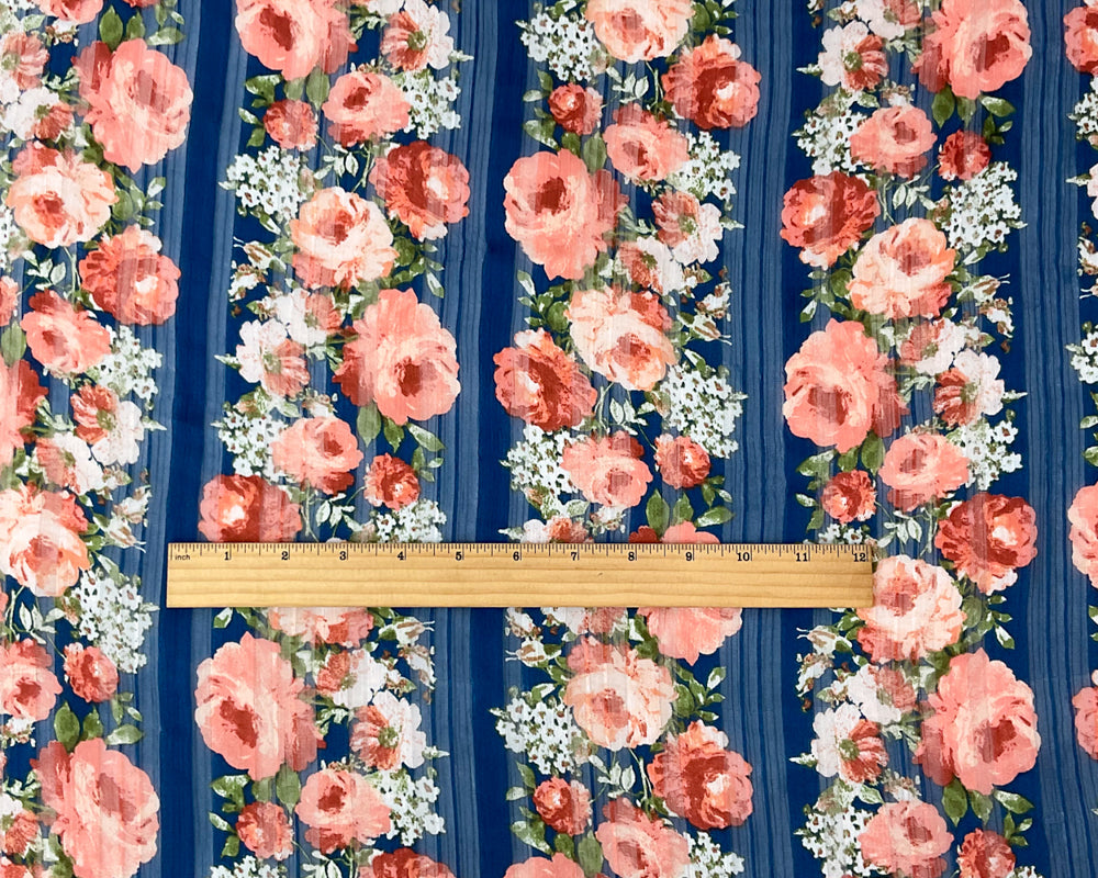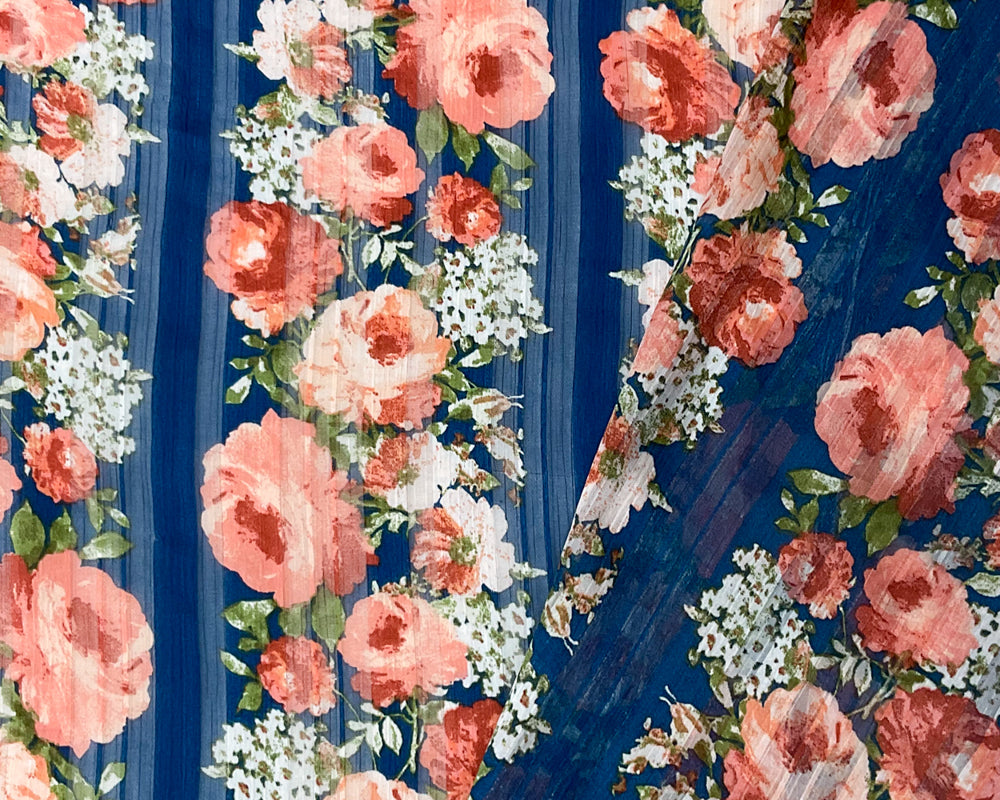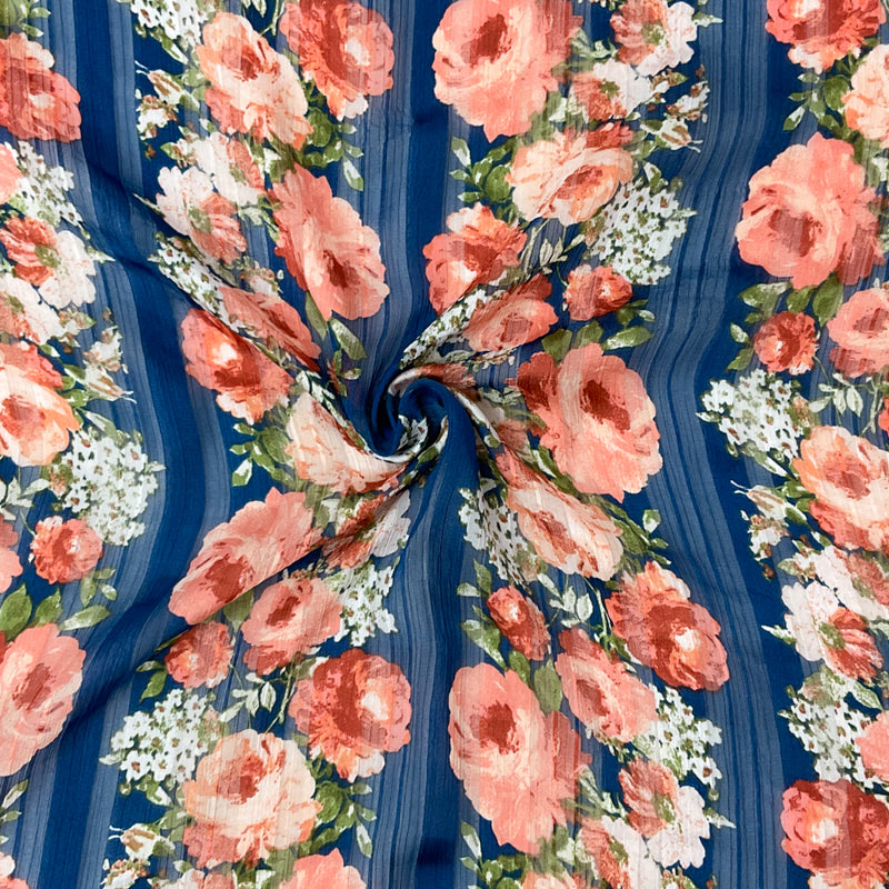 Blue-Multi Poly Floral Printed Satin Stripe Chiffon Woven Fabric