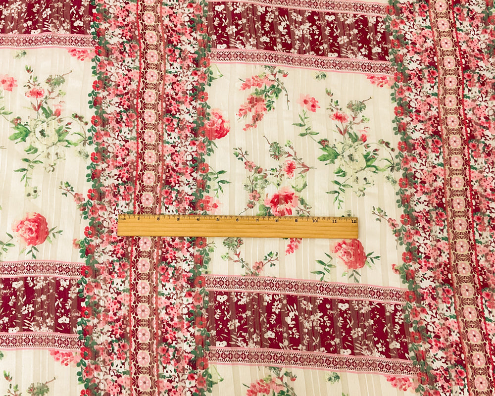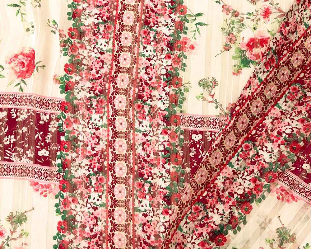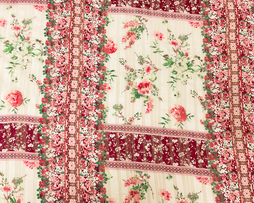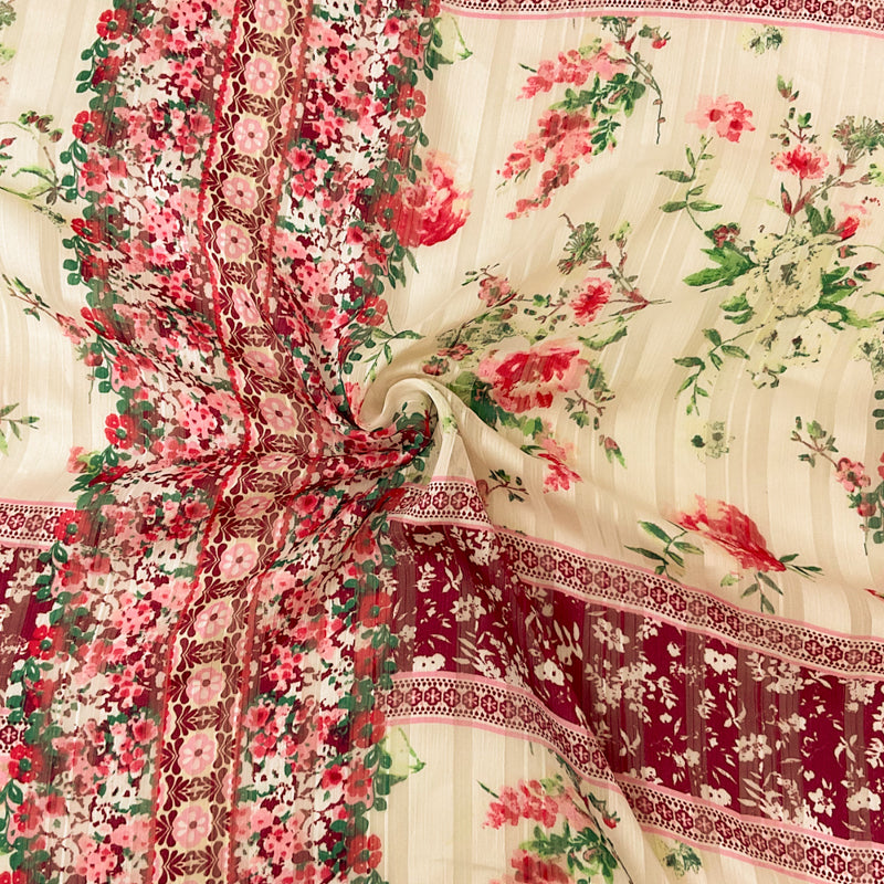 Ivory-Multi Stripe Floral Print Satin Stripe Chiffon Woven Fabric