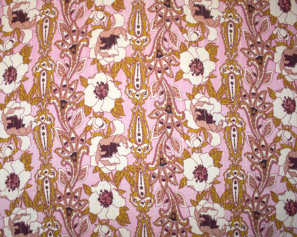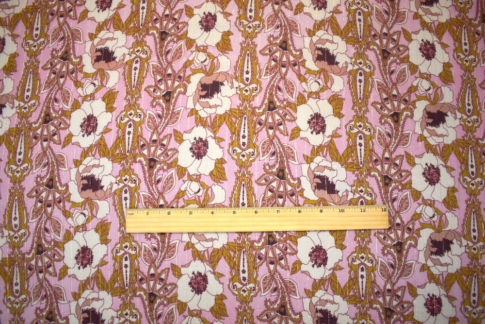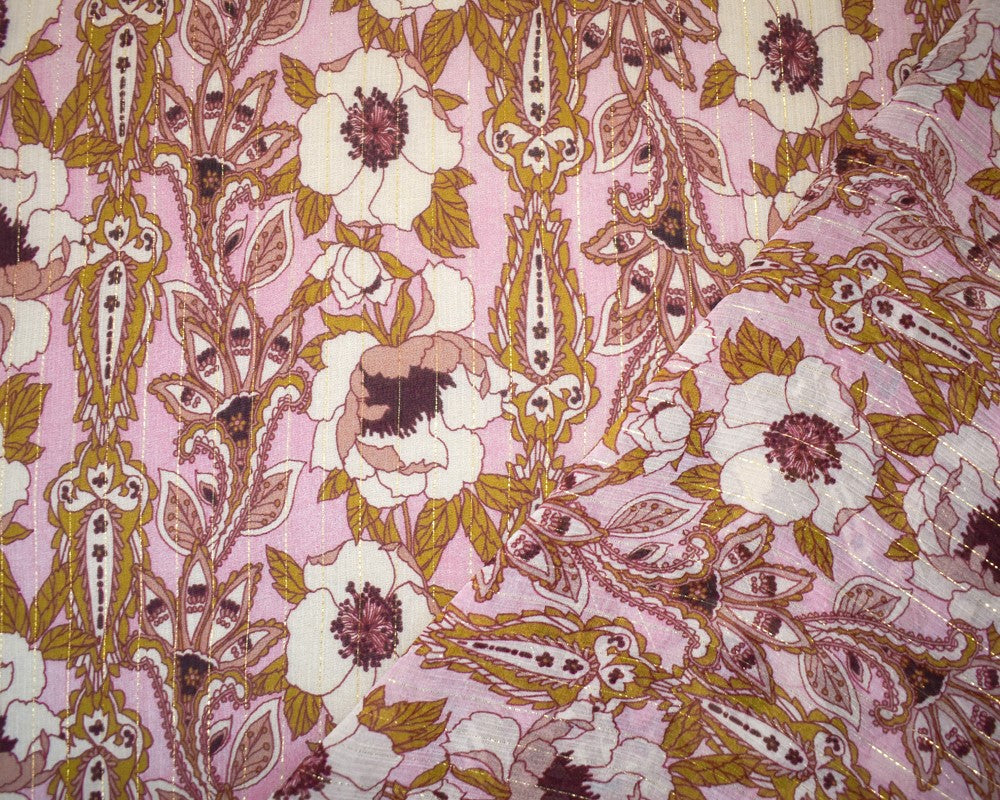 Pink-Gold-Multi Floral Printed Metallic Crinkle Yoryu Chiffon Woven Fabric