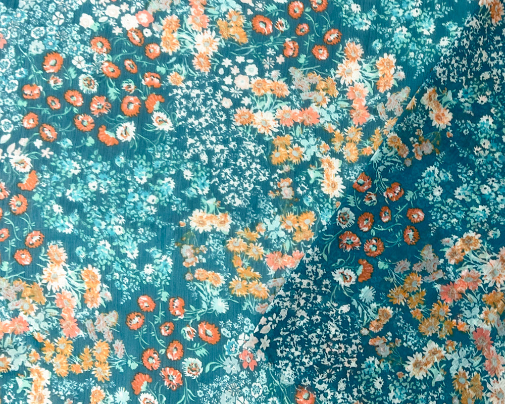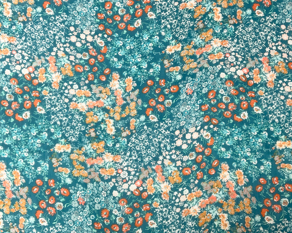 Teal-Multi Poly Floral Printed Crinkle Yoryu Chiffon Woven Fabric