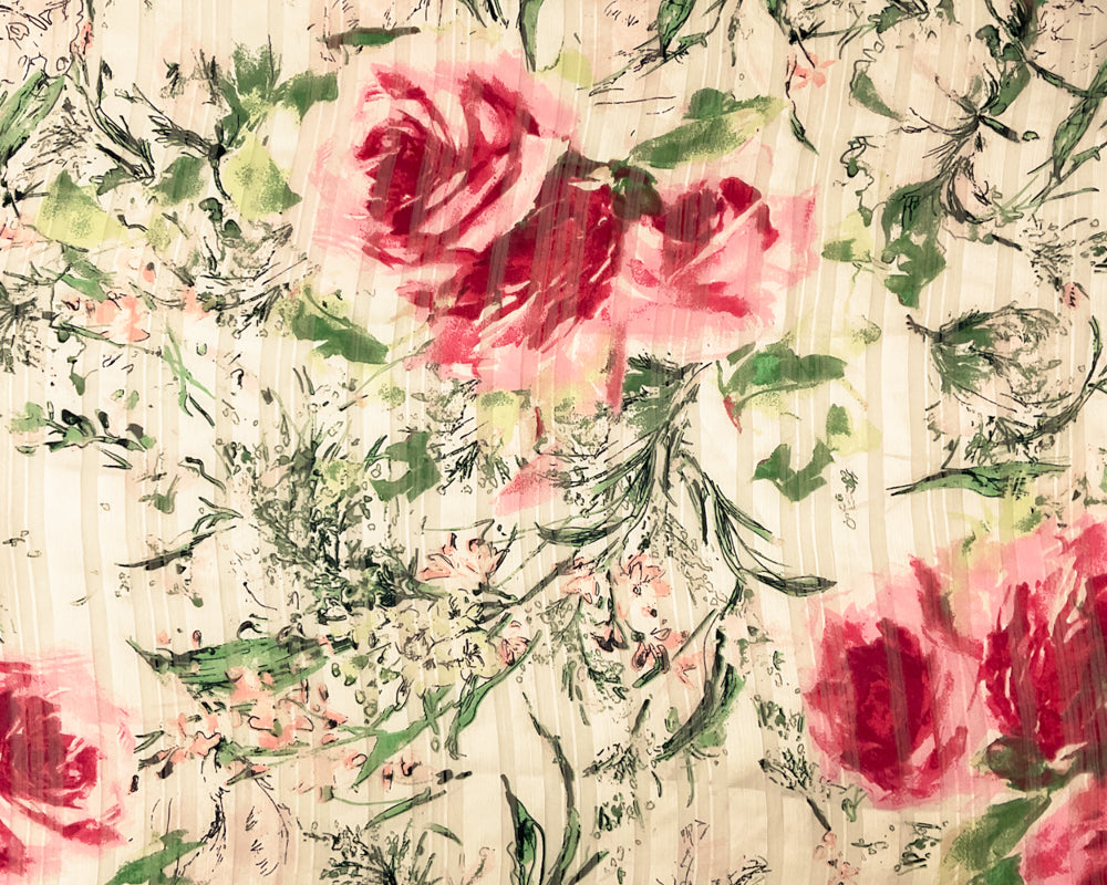 White-Multi Poly Floral Print Stripe Satin Chiffon Woven Fabric