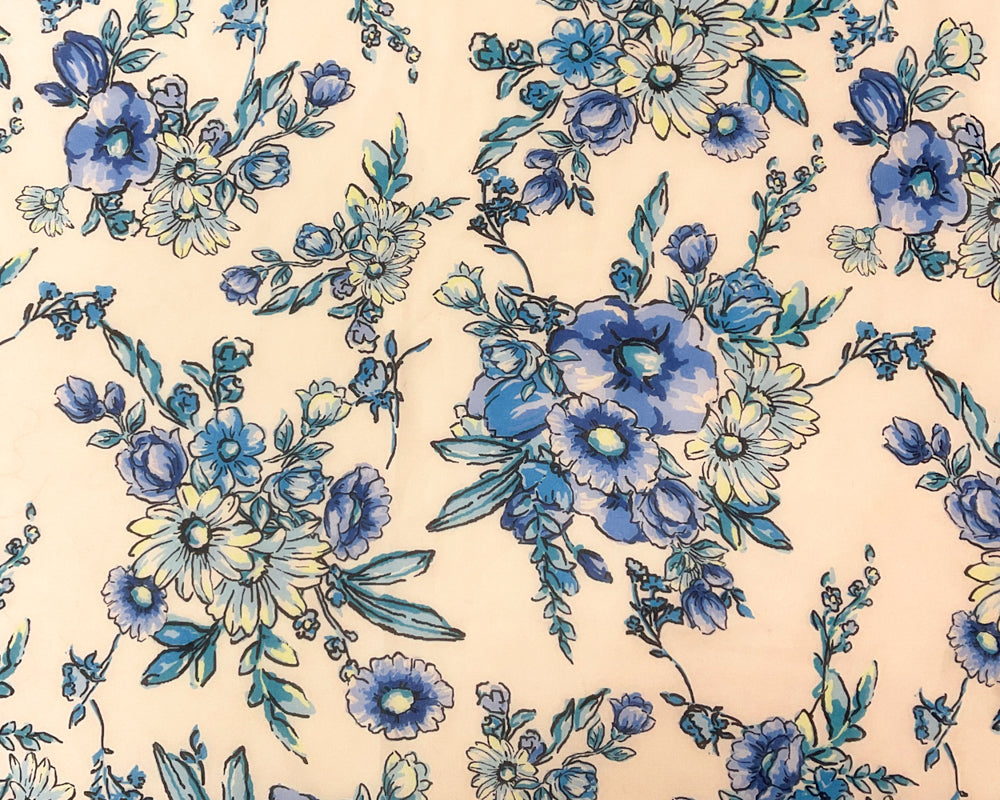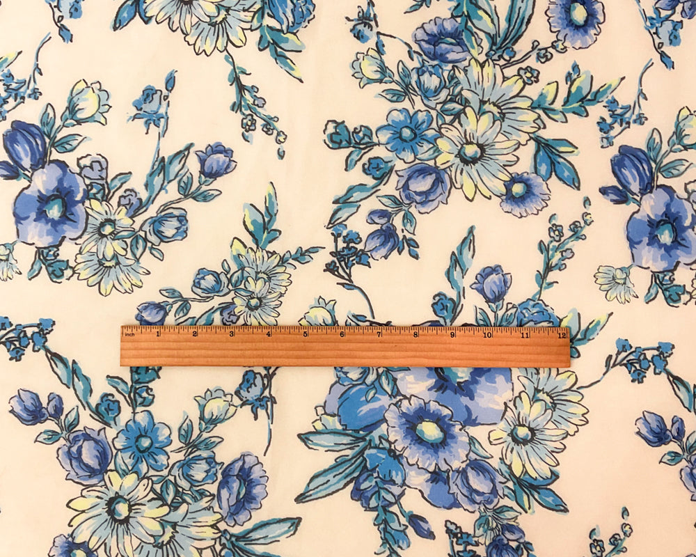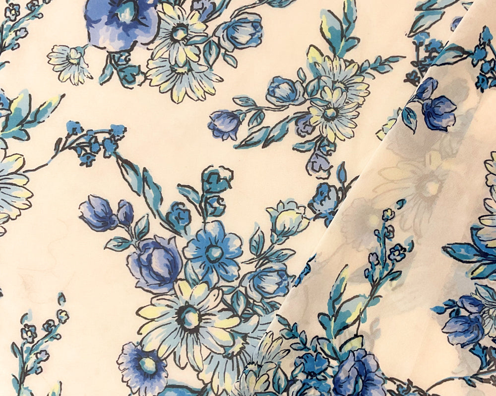 Ivory-Blue-Multi Poly Floral Printed Chiffon Woven Fabric