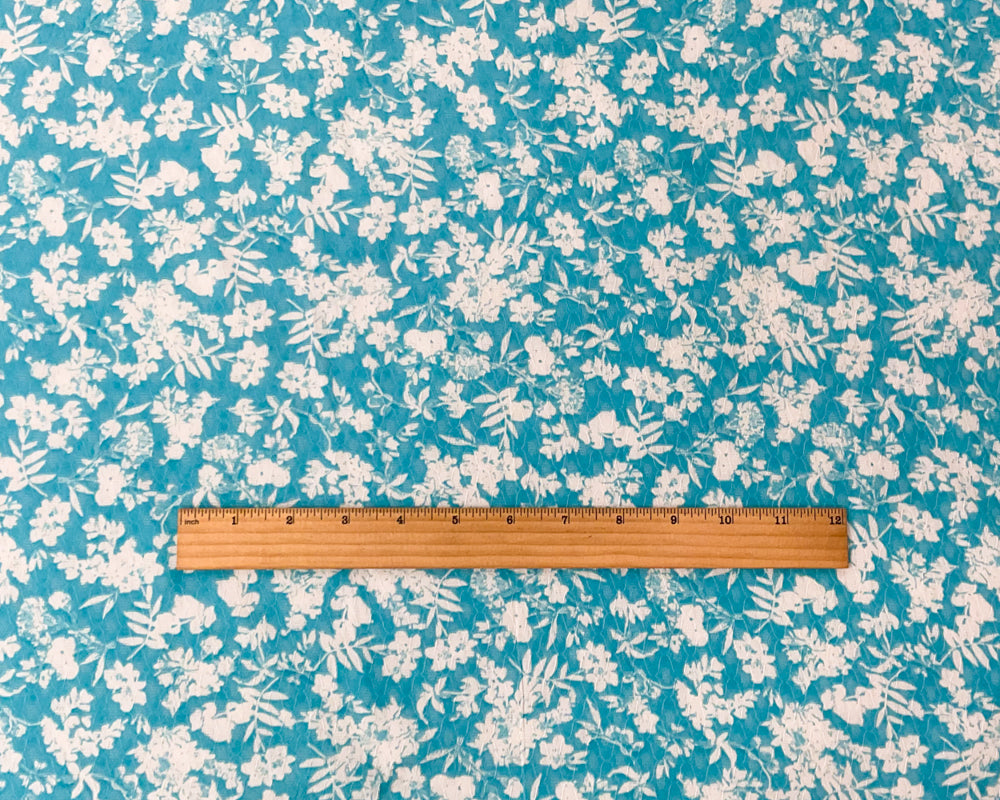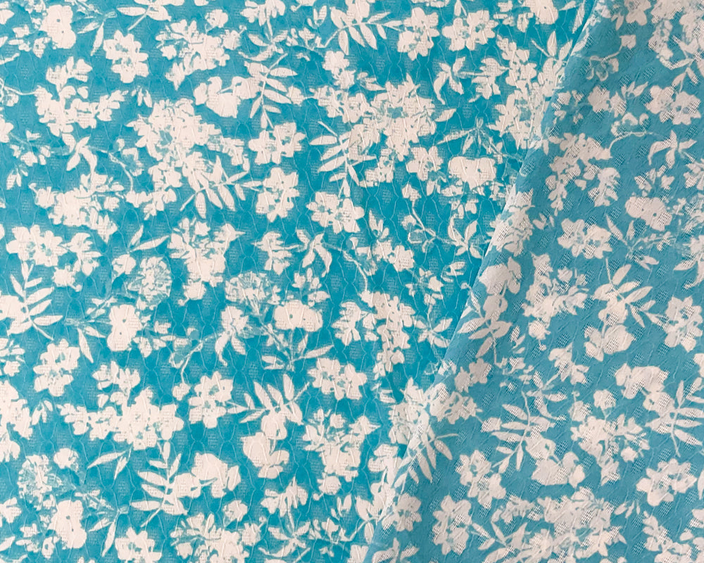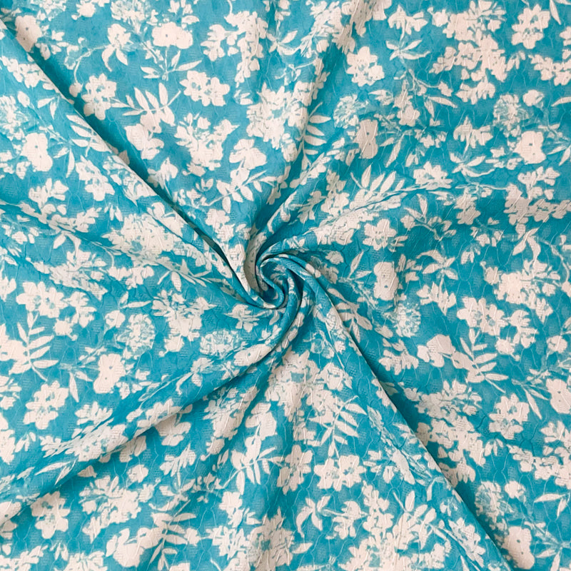 Turquoise-Ivory Floral Printed Ogee Dobby Chiffon Woven Fabric
