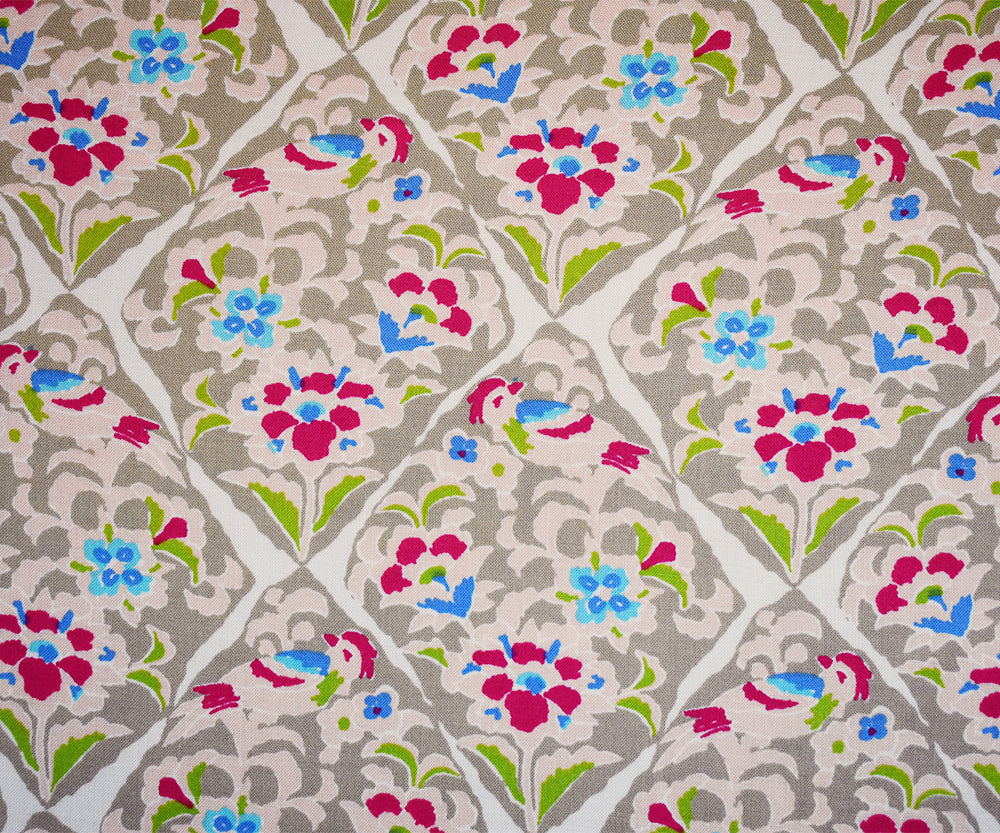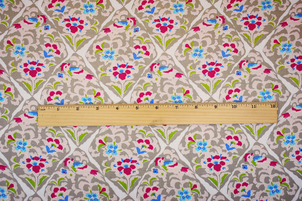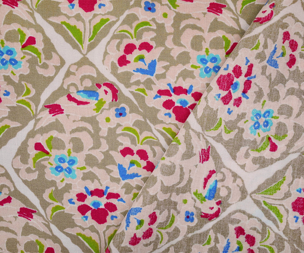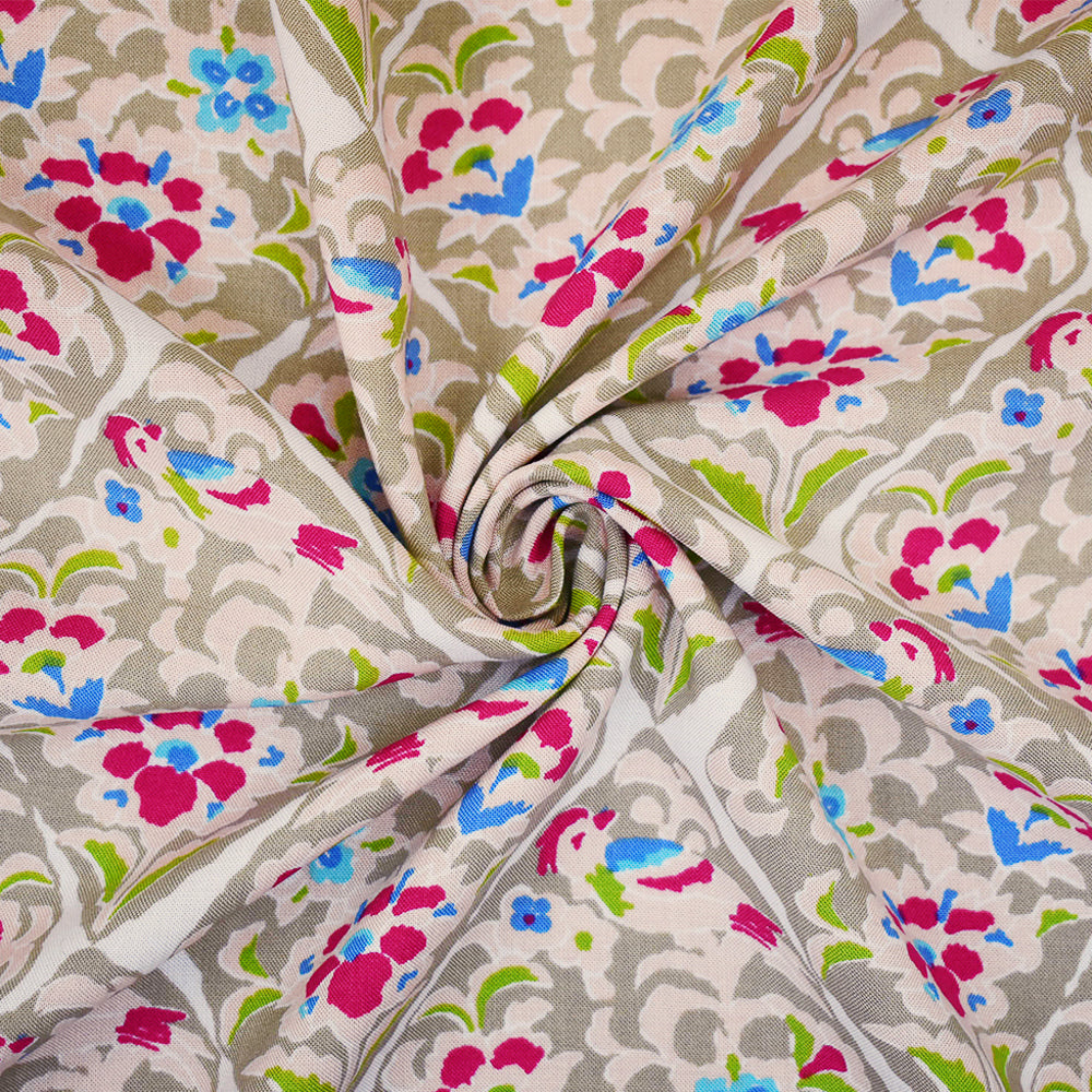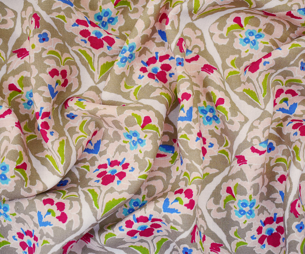 Beige-Pink-Multi Floral Tile Printed Rayon Challis Woven Fabric