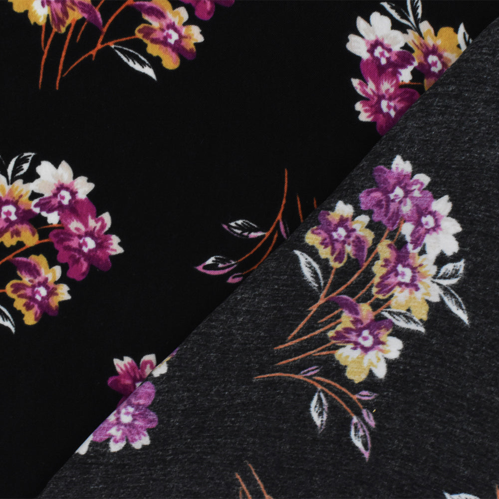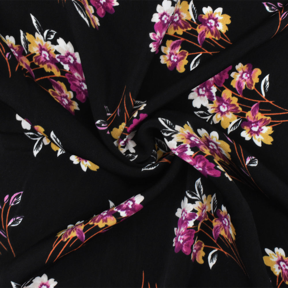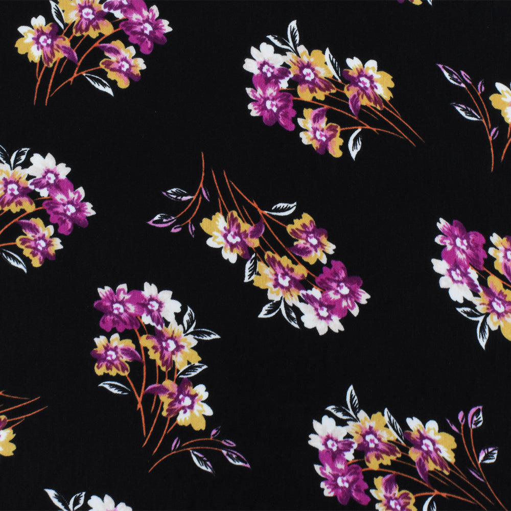 Black-Purple-Multi Floral Printed Poly Twill Satin Woven Fabric