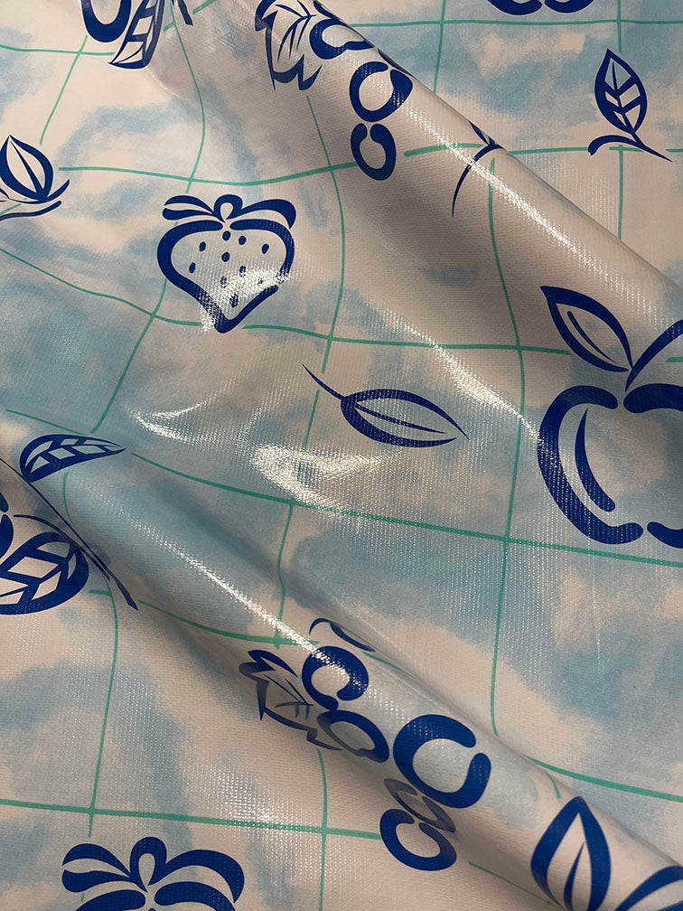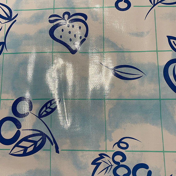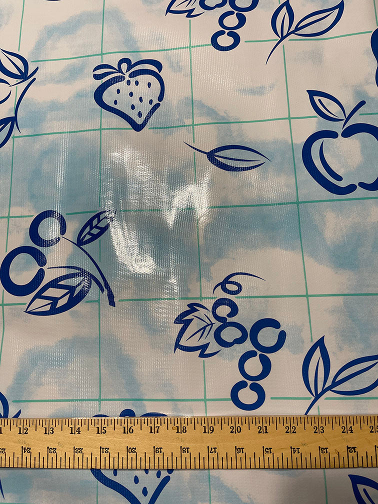 Blue Fruit Print with Aqua Check Print and Light Blue Shading on White Oilcloth Fabric