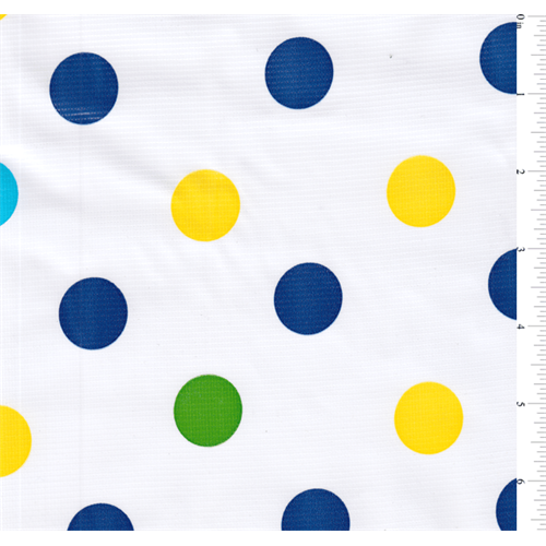 Blue, Turquoise, Green, and Yellow 1" Polka Dot Print on White Oilcloth Fabric
