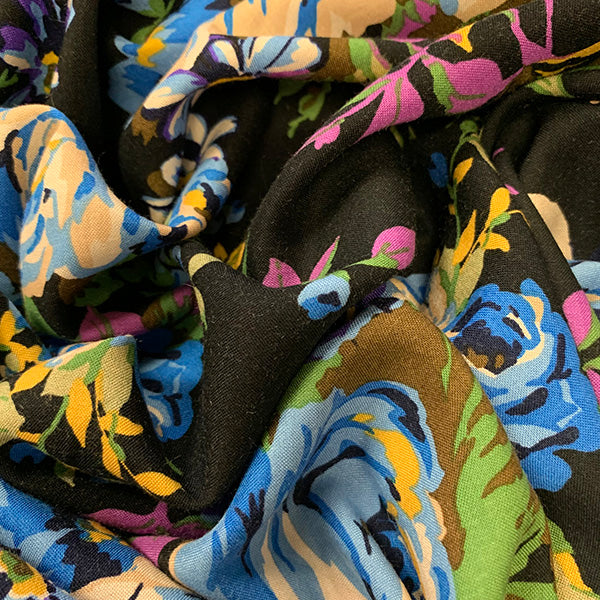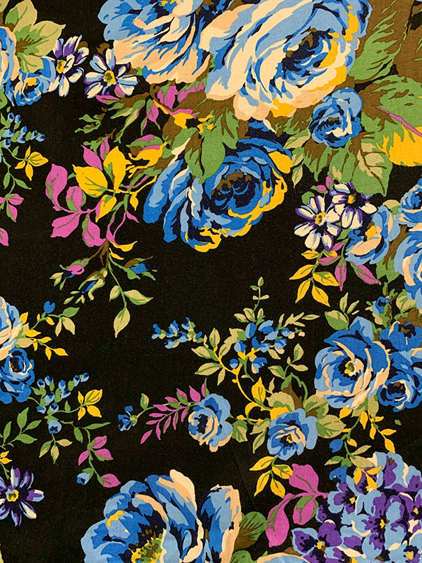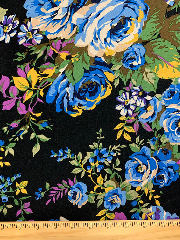 Blue Large Multi Rose Floral Print Rayon Challis Fabric