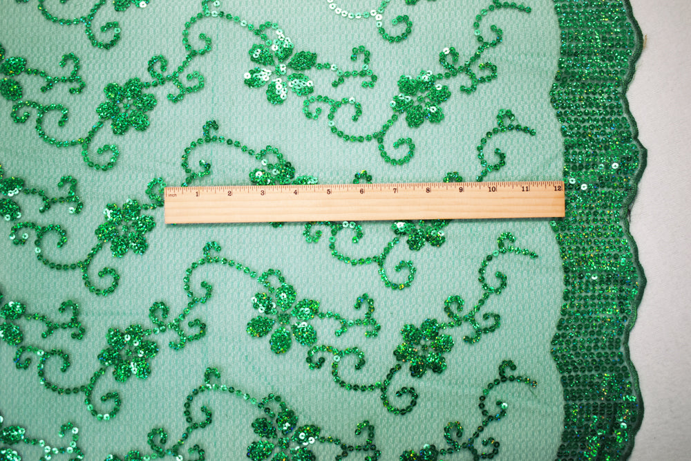 Green Nylon Embroidered Floral Sequin Scallop Tulle Mesh Fabric