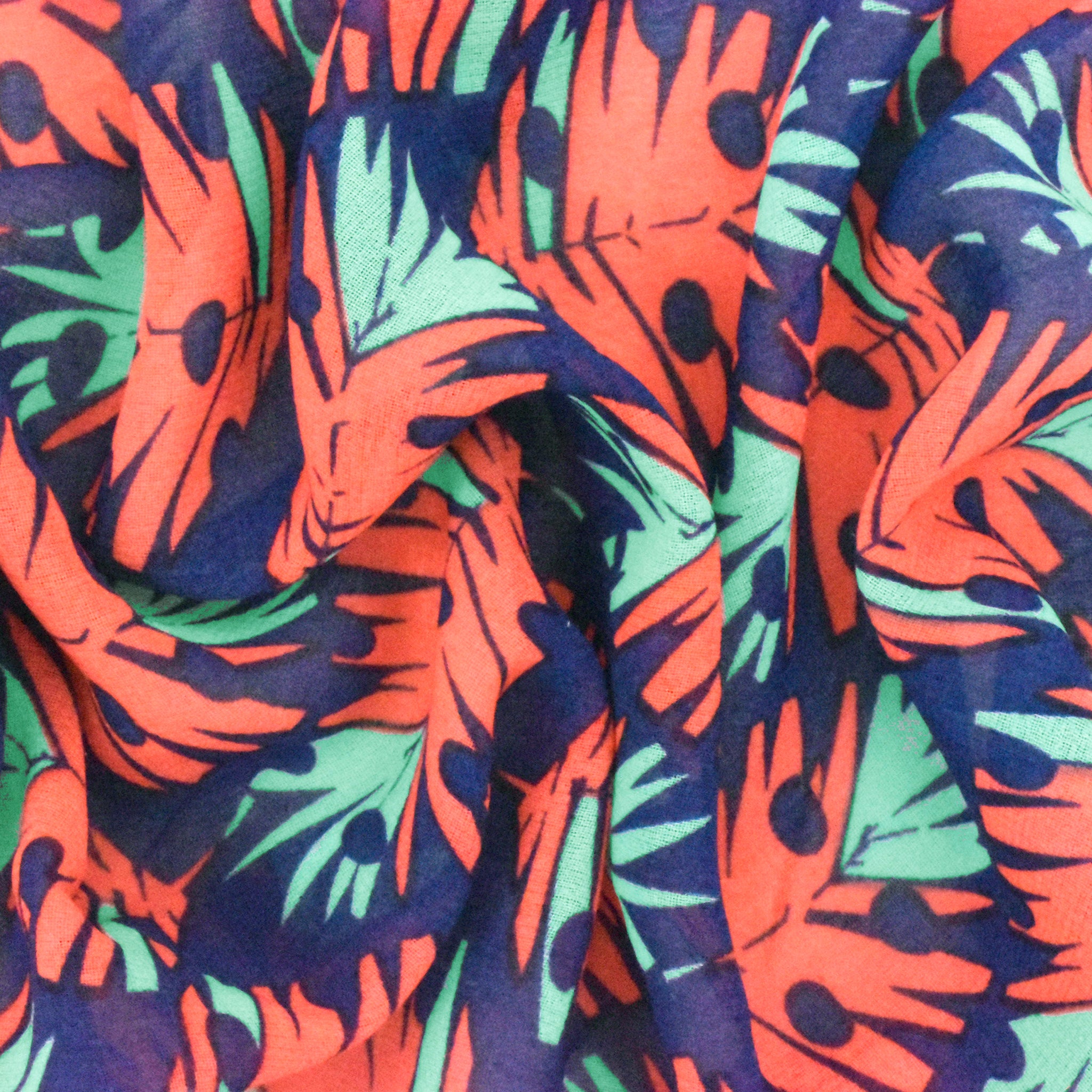 Ink Blue-Orange-Teal Leaves Printed Poly Chiffon Woven Fabric