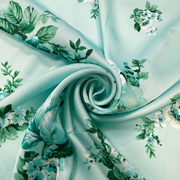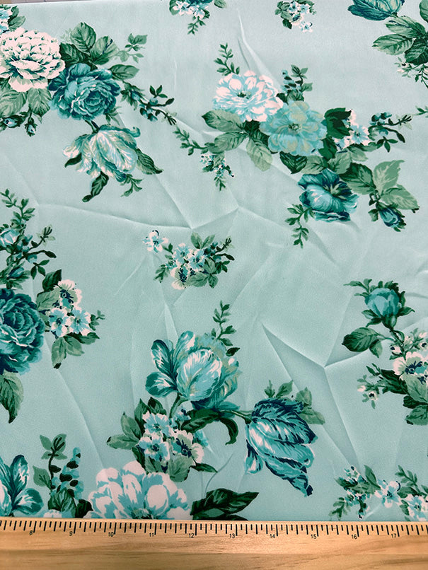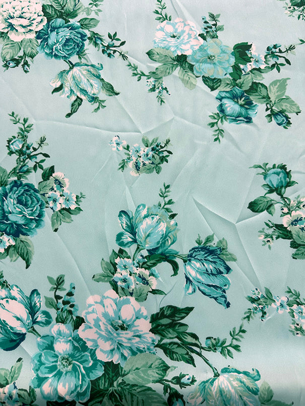 Mint Green Rose Print Poly Charmeuse Satin Fabric