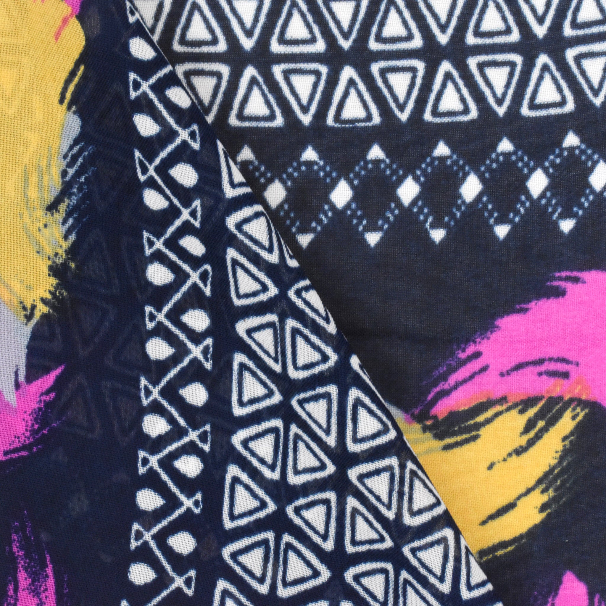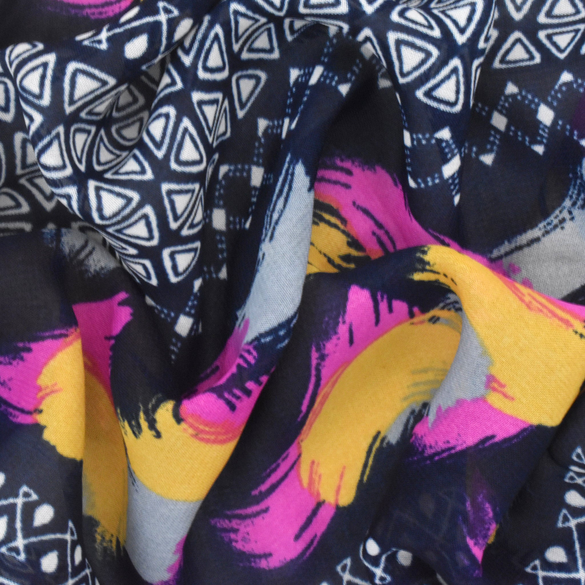 Navy Blue-Multi Painting And Aztec Stripe Printed Poly Chiffon Woven Fabric