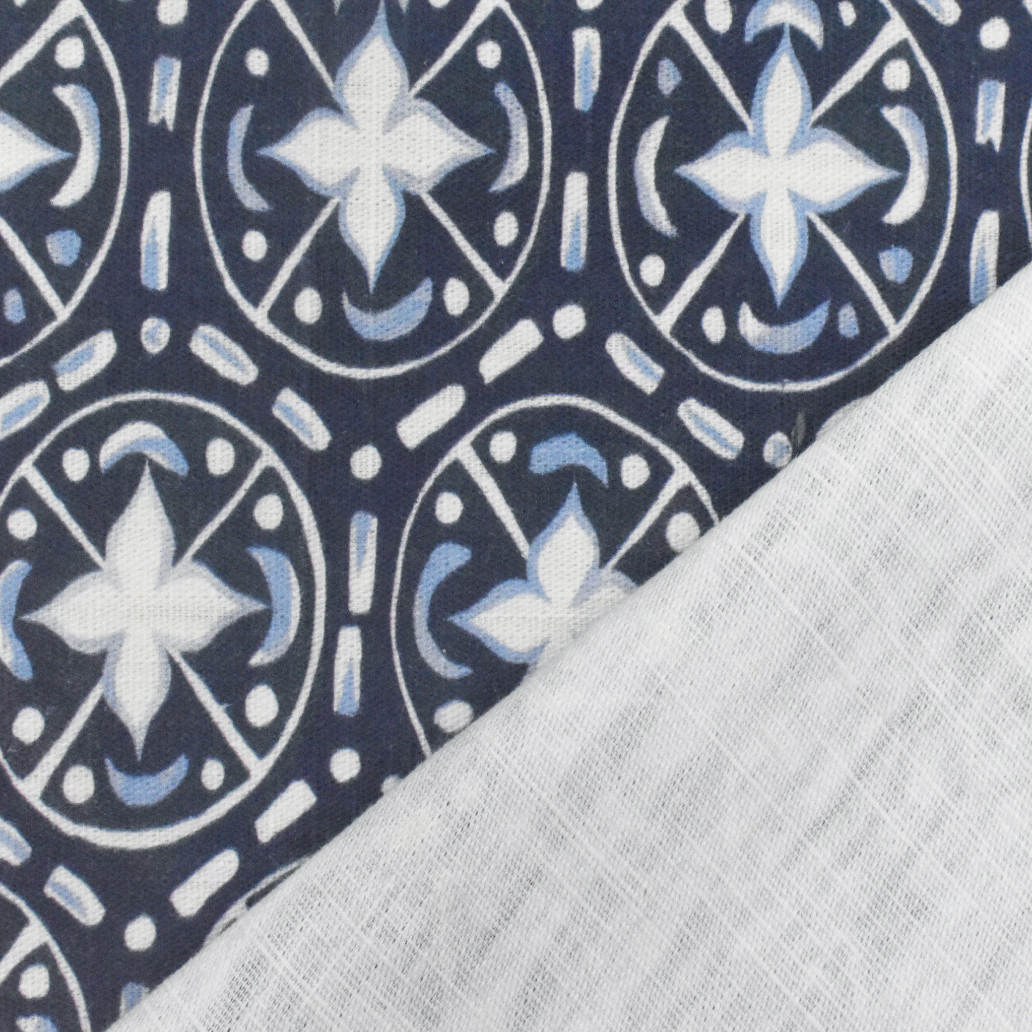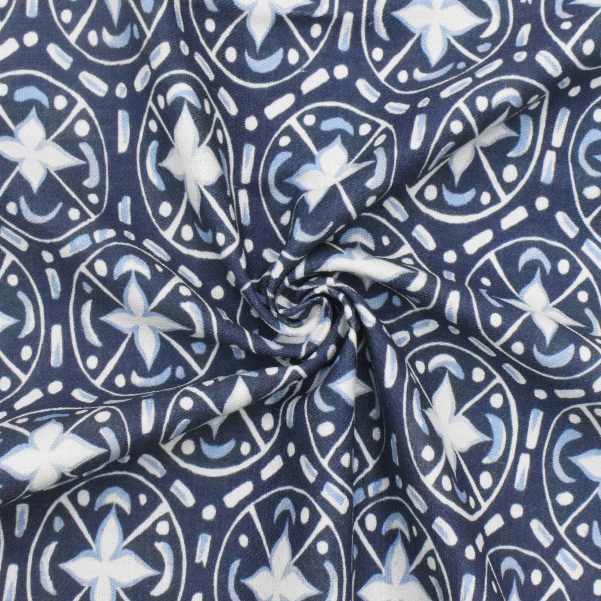 Navy-Sky-Ivory Abstract Tile Printed Slub Home Decorating Fabric