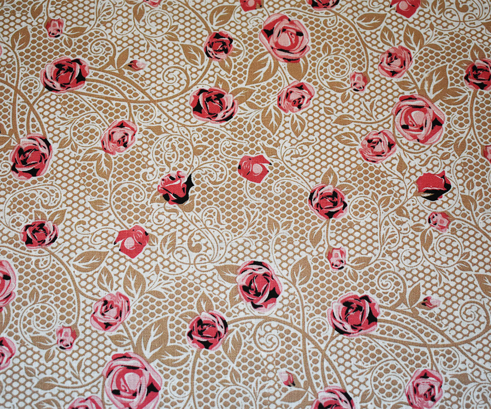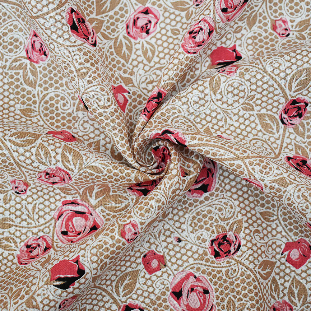 Pink-Beige-Multi Floral Mesh Pattern Printed Linen Woven Fabric
