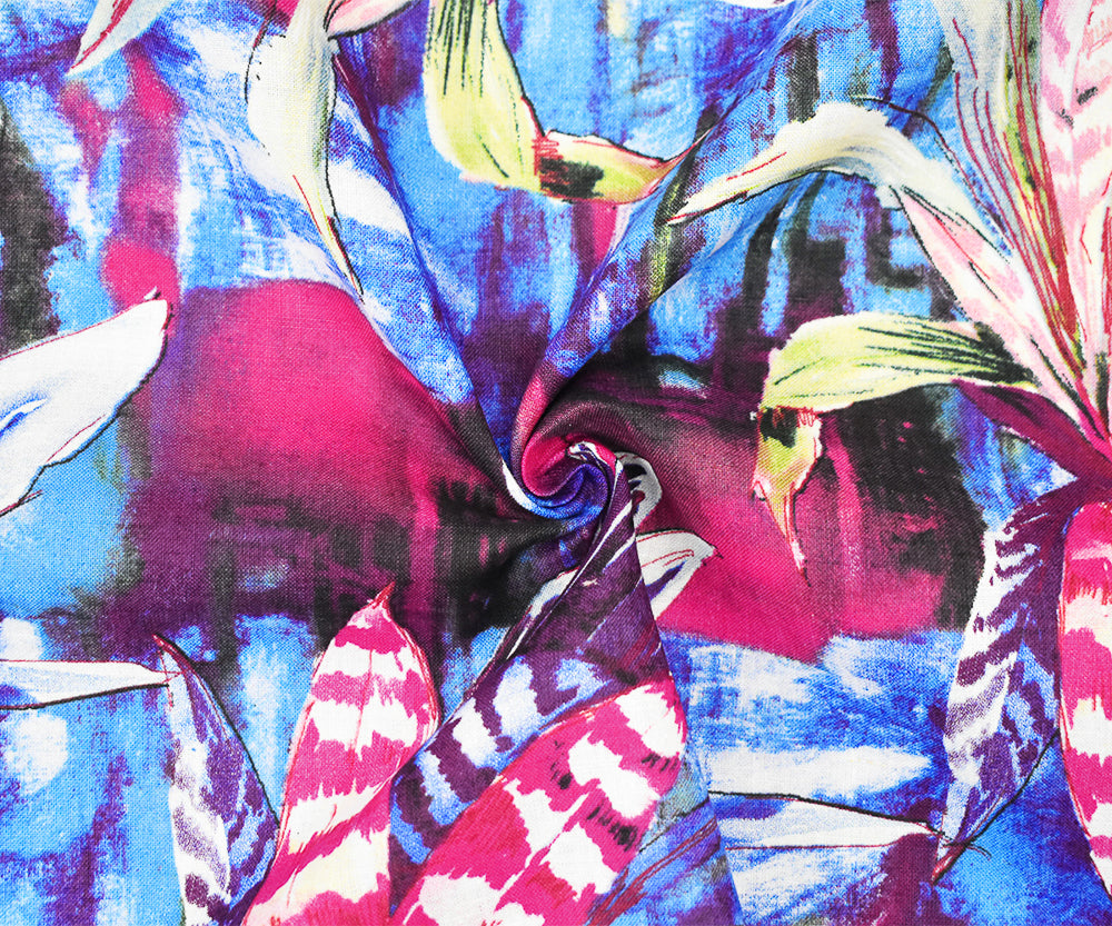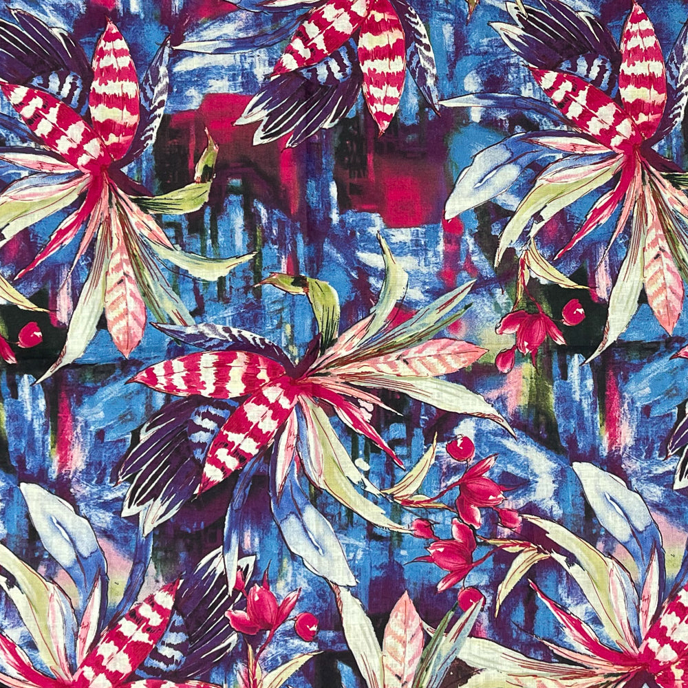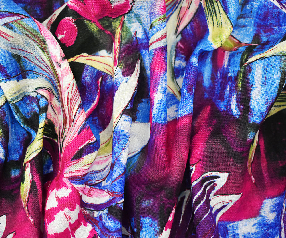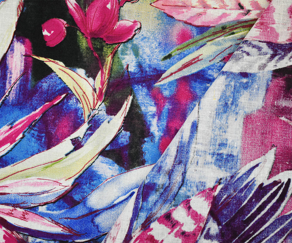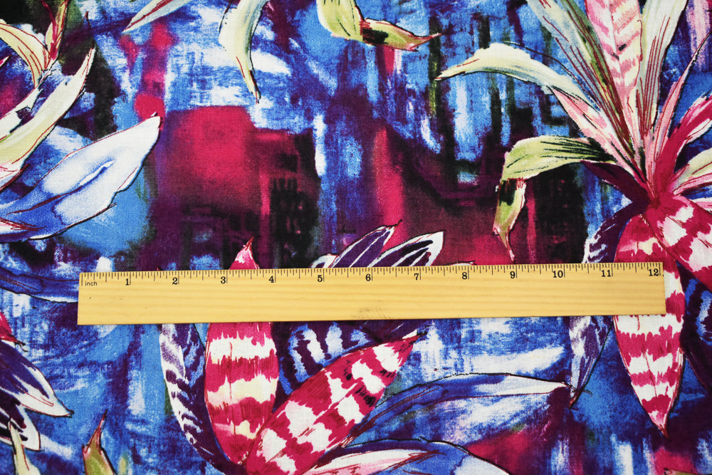 Purple-Fuchsia-Multi Tropical Leaf and Floral Art Print Linen Woven Fabric