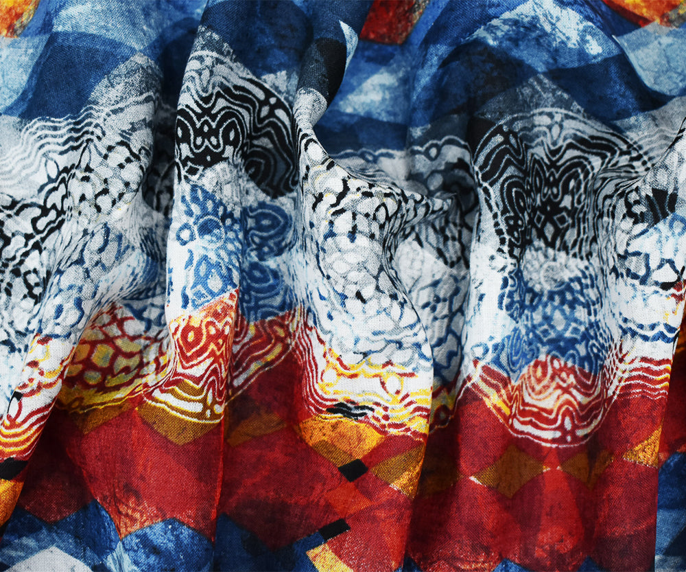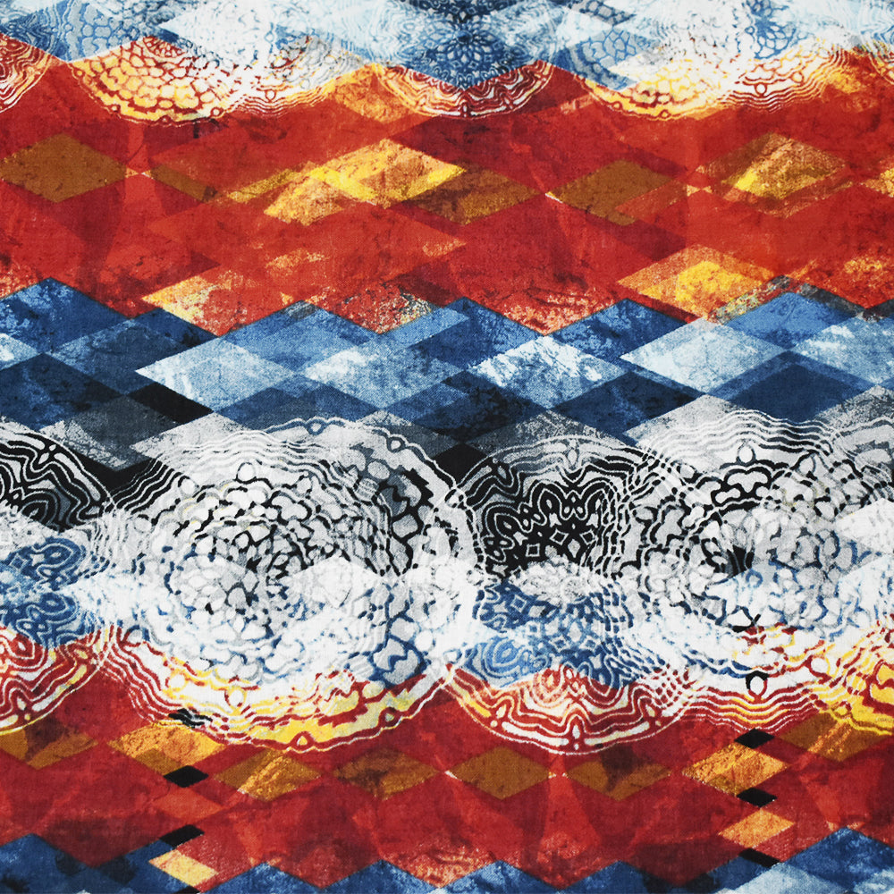 Red-Blue-Multi Diamond Medallion Pattern Printed Linen Woven Fabric