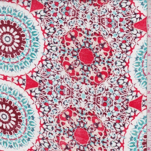 Red Coral/White/Maroon Circle Medallion Rayon Crinkle Fabric