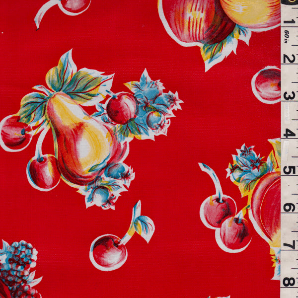 Red, White, Blue, Yellow, and Green Fruit and Floral Print on Red Oilcloth Fabric