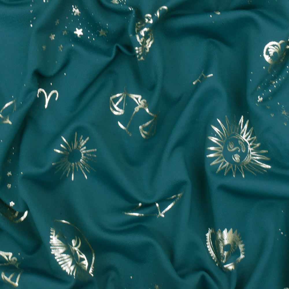 -Zodiac elements pattern foil printed on a tricot swimwear and yoga knit fabric from a famous yoga wear company