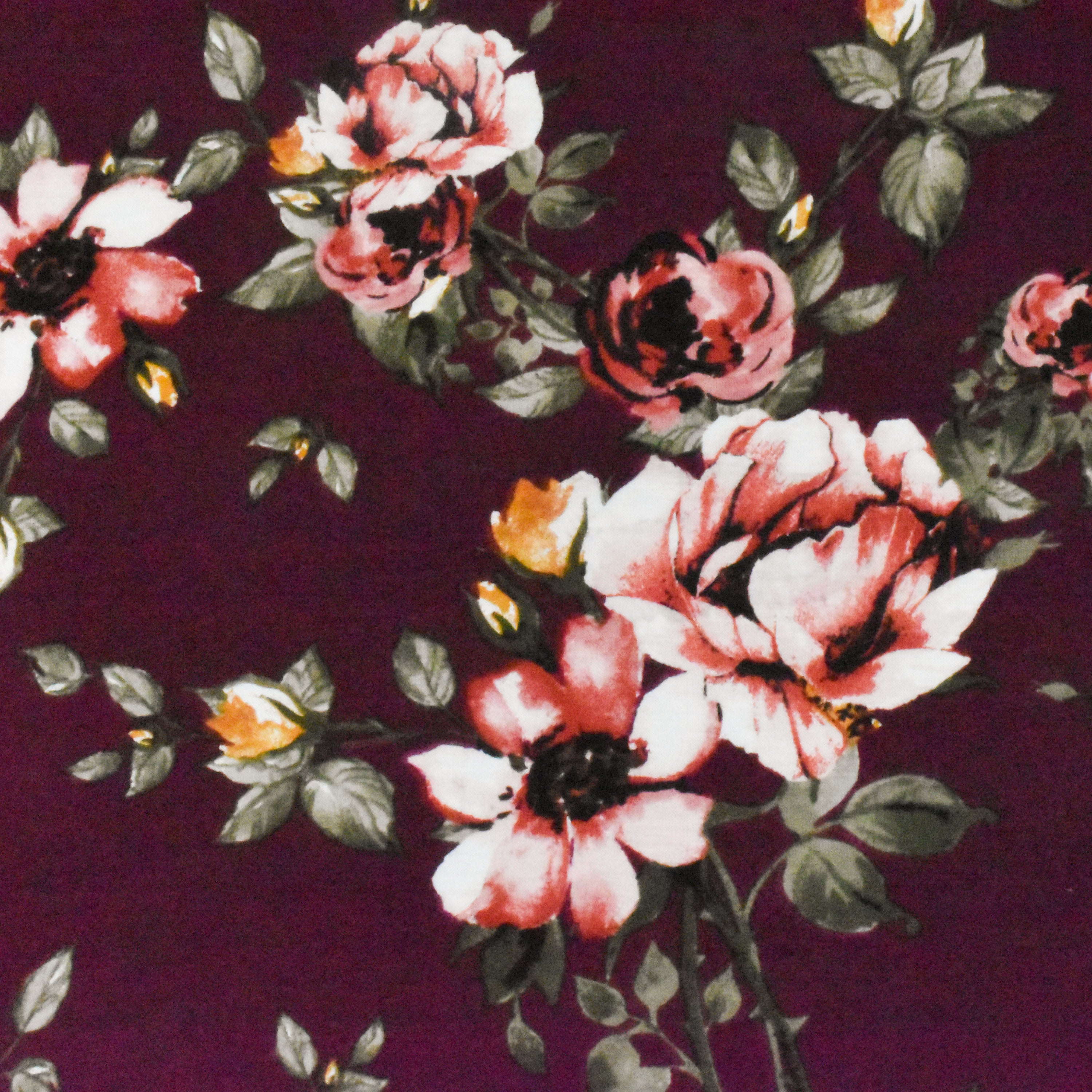 Vintage Maroon-Olive-Multi Floral Printed Stretch Rayon Jersey Knit Fabric